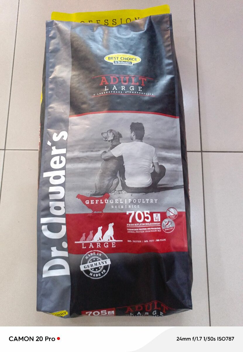 Alimentation premium Dr. Clauder's pour chiens de grande taille. Favorise une condition physique optimale et une digestion saine. Idéal pour une nutrition équilibrée au quotidien. Sac de 705g pour maintient et vitalité.