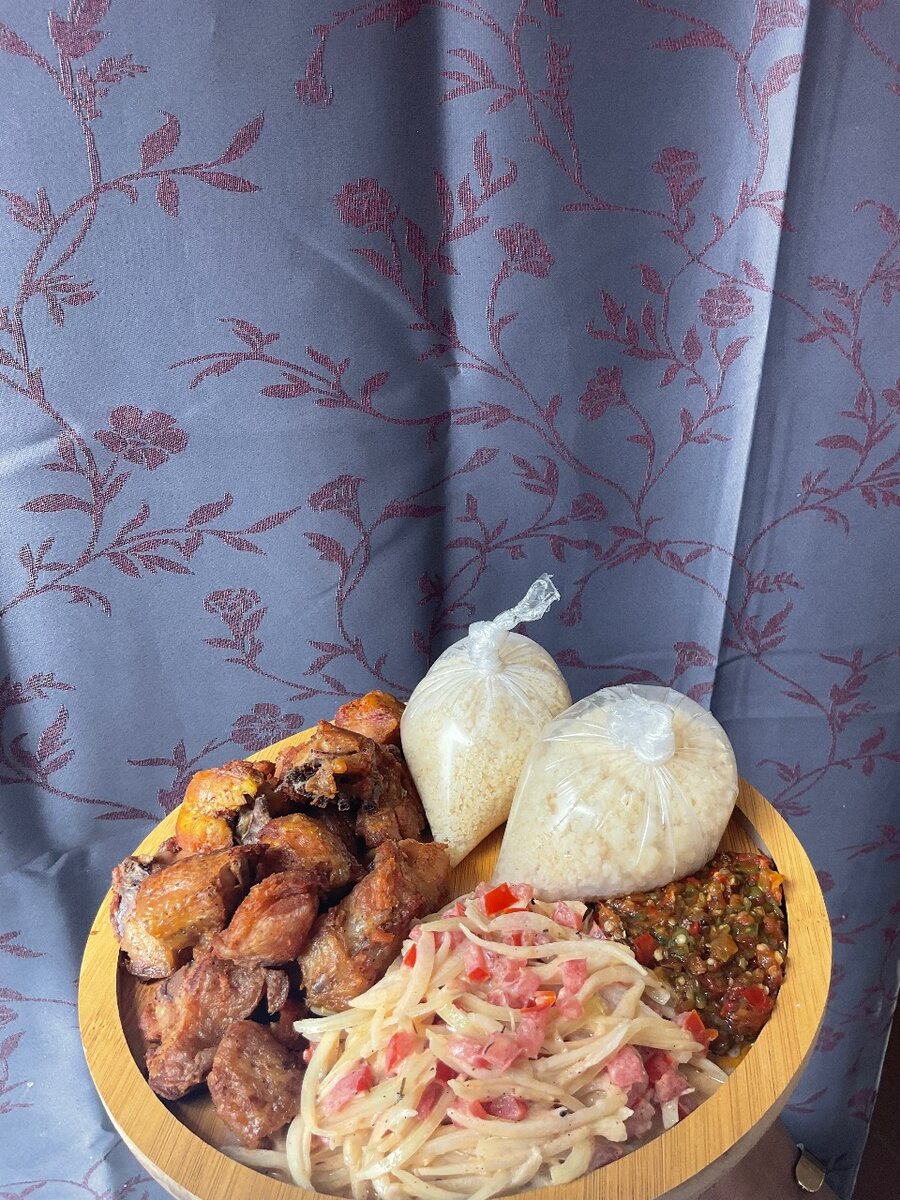 Un plat savoureux composé de morceaux tendres de cul de dindon grillés ou frits, assaisonnés à lafricaine. Servi avec de lattiéké bien aérien, accompagné souvent doignons, tomates, piment et sauce maison pour un pur délice ivoirien.