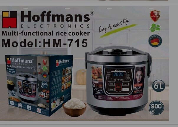Découvrez le cuiseur à riz multi-fonction Hoffmans HM-715, d'une capacité de 6L et d'une puissance de 900W. Parfait pour préparer des repas délicieux avec facilité. Idéal pour les familles et les amateurs de cuisine.