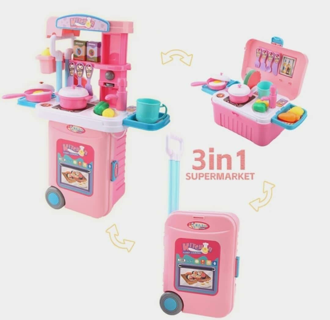 Une cuisine éducative 3-en-1 idéale pour stimuler l'imaginaire des enfants. Comprend des accessoires variés pour cuisiner, servir et jouer au supermarché. Facile à transporter grâce à sa conception en valise.