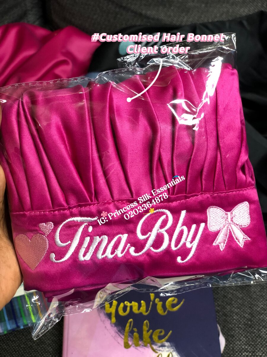 Our Customized Hair Bonnets are specially Hand made head coverings designed to protect your hair while you sleep or during daily activities. They can be personalized with your preferred names in different colors, patterns, and materials to suit your style and hair care needs. These bonnets help prevent frizz, breakage, and moisture loss, keeping your hair healthy and styled.
