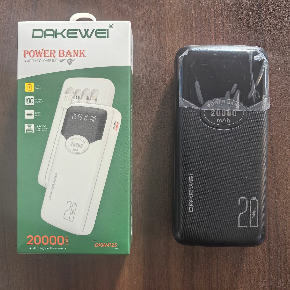 DAKEWEI 20000mAh移动电源,配备多种连接线,适合日常和旅行使用。支持多个设备同时充电,带数字显示电量。不再担心电量不足,确保设备时刻在线。