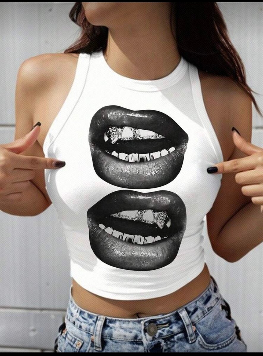 Optez pour ce débardeur blanc audacieux avec un imprimé artistique de lèvres noires. Sa coupe flatteuse et son design original le rendent parfait pour une tenue décontractée. Associez-le avec un jean ou un short pour un look tendance et confortable en toute occasion. Idéal pour les sorties estivales ou les soirées entre amis.