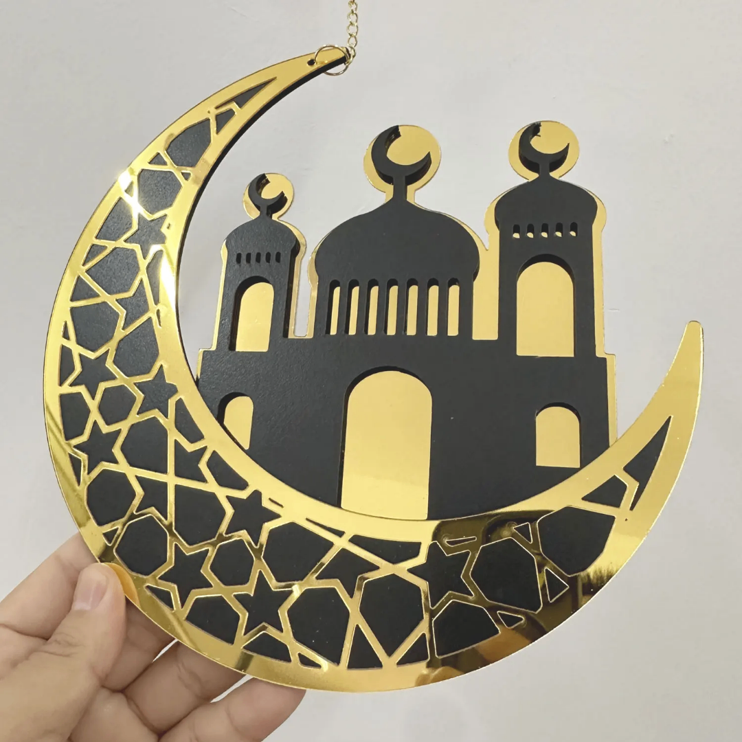 Ajoutez une touche élégante à votre intérieur avec cette décoration murale en forme de lune dorée et motif mosquée. Parfaite pour créer une ambiance chaleureuse et inspirante dans votre maison. Idéale pour le salon ou la chambre.