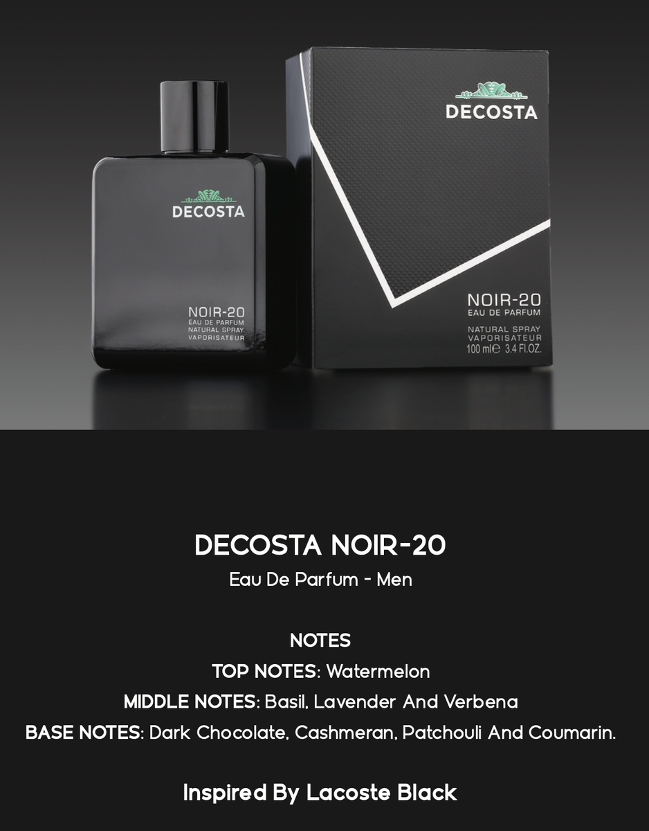 Découvrez l'élégance masculine avec DECOSTA NOIR-20. Notes captivantes de pastèque et basilic, enrichies de lavande et verveine. Un parfum irrésistible avec une base de chocolat noir et cachemire. Idéal pour l'homme moderne et sophistiqué.