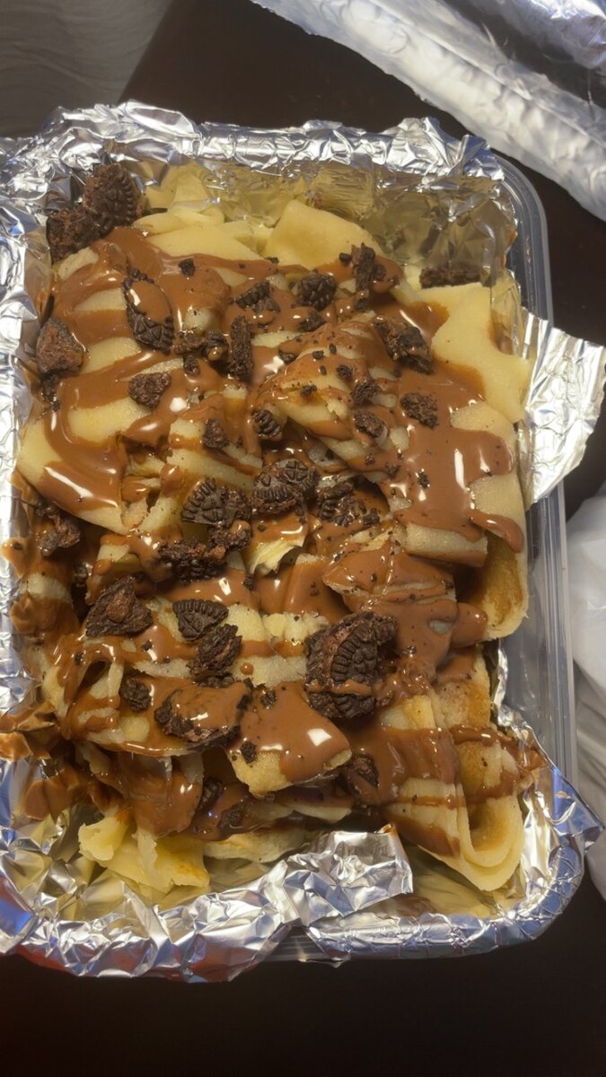 Savourez des crêpes garnies de chocolat fondant et de morceaux croquants. Parfait pour une envie sucrée ou un dessert gourmand. Idéal pour partager ou se faire plaisir seul.