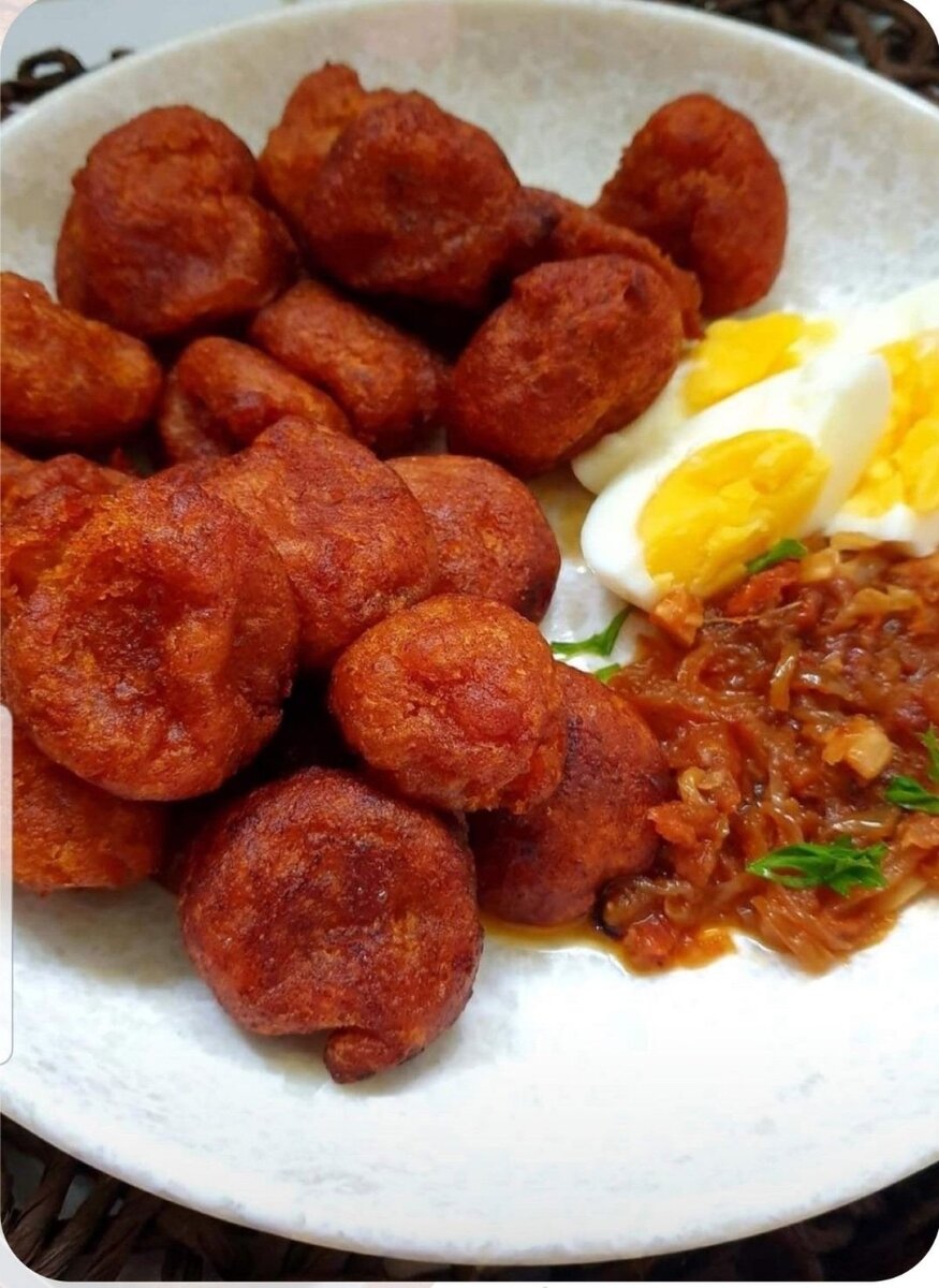 Savourez la richesse des plantains frits croustillants, accompagnés d'une sauce piquante et d'œufs durs. Parfait pour un repas gourmand et chaleureux. Un incontournable pour régaler vos papilles à tout moment!