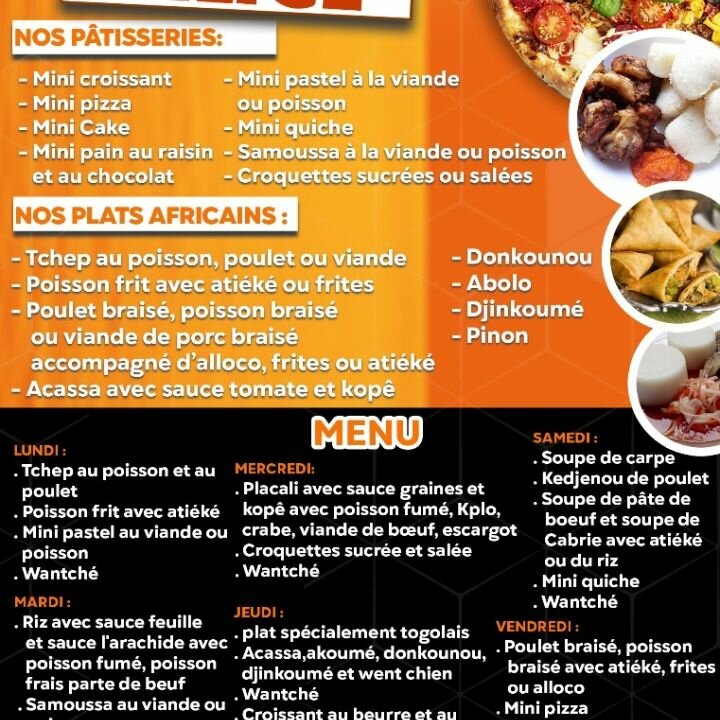 Découvrez nos délices africains avec des plats et pâtisseries authentiques. Savourez des tchops tels que le poisson grillé, poulet braisé, et une variété de croquettes sucrées et salées. Parfait pour les amateurs de cuisine africaine.