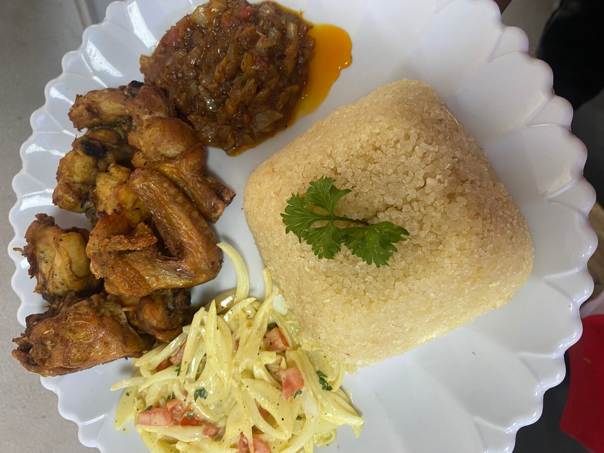 Savourez la richesse des saveurs africaines avec ce plat complet : poulet rôti parfumé, attieke moelleux, salade fraîche et sauce épicée. Parfait pour un déjeuner ou dîner exotique.