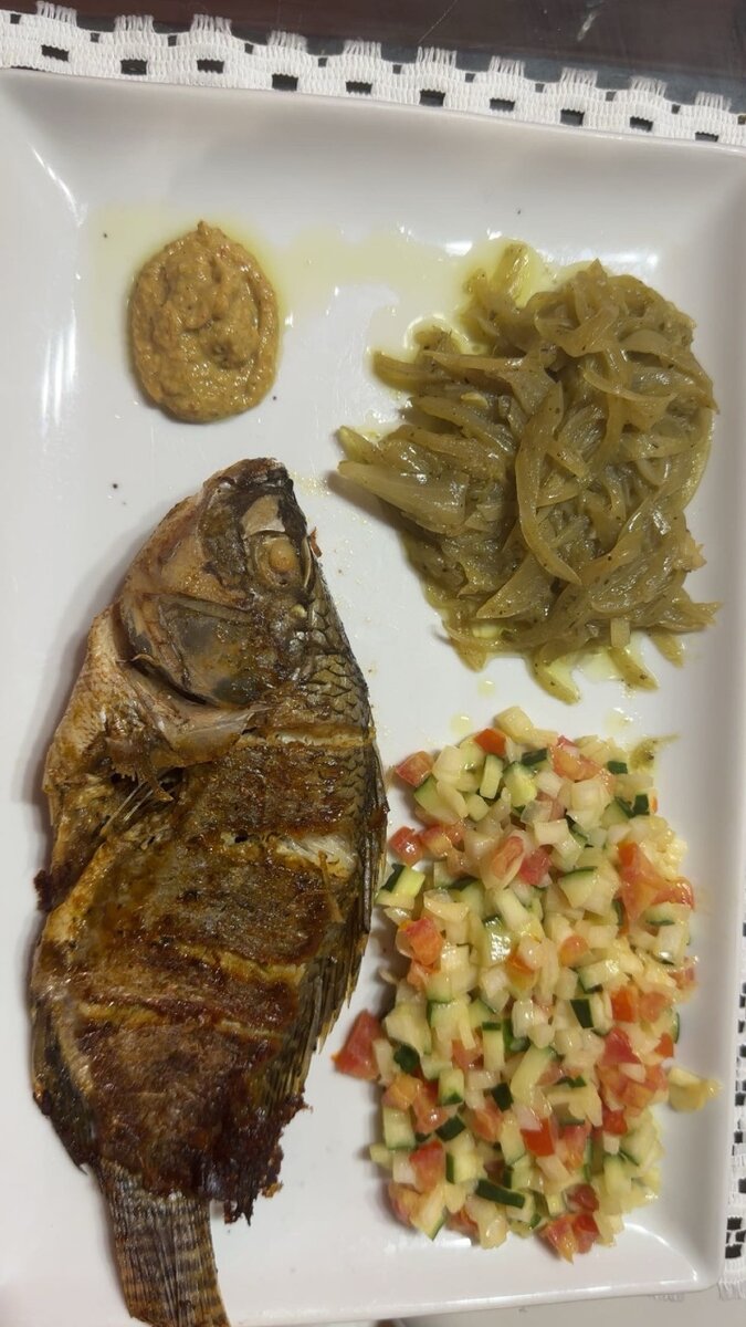 Savourez un plat composé de poisson frit à la poêle façon au four, accompagné d'une garniture épicée et de délicieuses bananes plantains frites. Une explosion de saveurs exotiques pour un repas authentique.