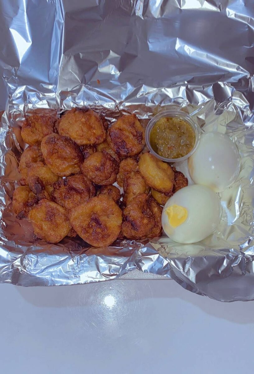 Savourez nos beignets croustillants accompagnés d'œufs durs et d'une sauce piquante. Parfait pour un repas rapide et délicieux, idéal pour partager ou déguster en solo. Faites avec des ingrédients frais pour un goût inégalé.
