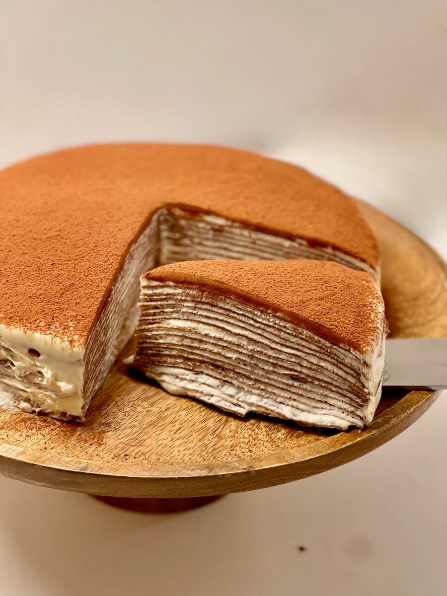 Savourez notre gâteau mille-crêpes exceptionnel, composé de fines couches de crêpes délicates et de crème onctueuse, parsemé d'une fine poudre de cacao sur le dessus. Idéal pour un dessert raffiné, il est parfait pour toutes vos occasions spéciales ou simplement pour se faire plaisir à la maison.