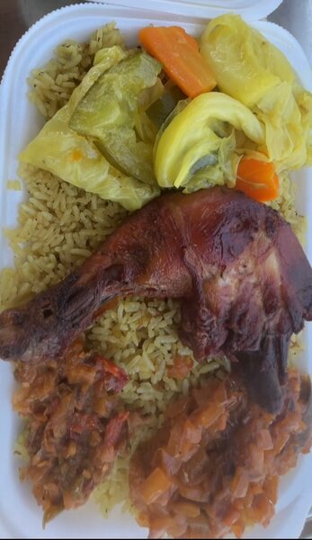 Savourez un succulent repas avec notre poulet grillé parfaitement assaisonné, servi avec du riz parfumé, des légumes variés et des épices riches.