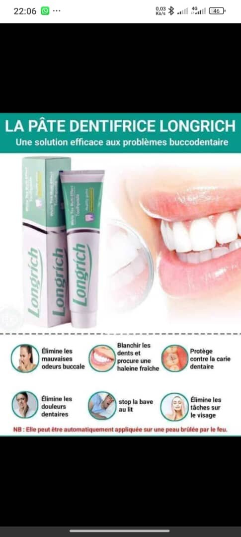 Découvrez le dentifrice Longrich, votre allié pour une hygiène buccodentaire impeccable. Formulé pour éliminer les bactéries, blanchir les dents et protéger contre les caries, il laisse une haleine fraîche et durable. Idéal pour toute la famille, il elimine aussi les boutons