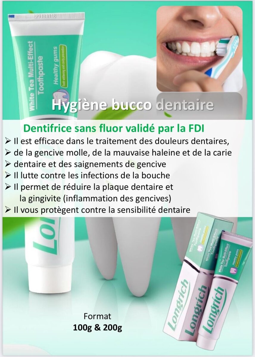 Dentifrice Longrich sans fluor, idéal pour traiter douleurs dentaires, saignements de gencive et mauvaise haleine. Réduit plaque dentaire et gingivite. Format 200g. Hygiène bucco-dentaire améliorée et protection contre sensibilité dentaire.