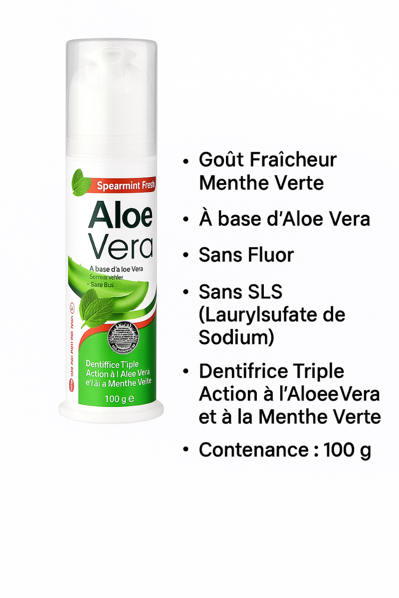 Découvrez notre dentifrice Triple Action à l'Aloe Vera et Menthe Verte. Formule sans fluor, SLS et douce pour vos dents. Parfait pour une fraîcheur durable! Contenance: 100g.