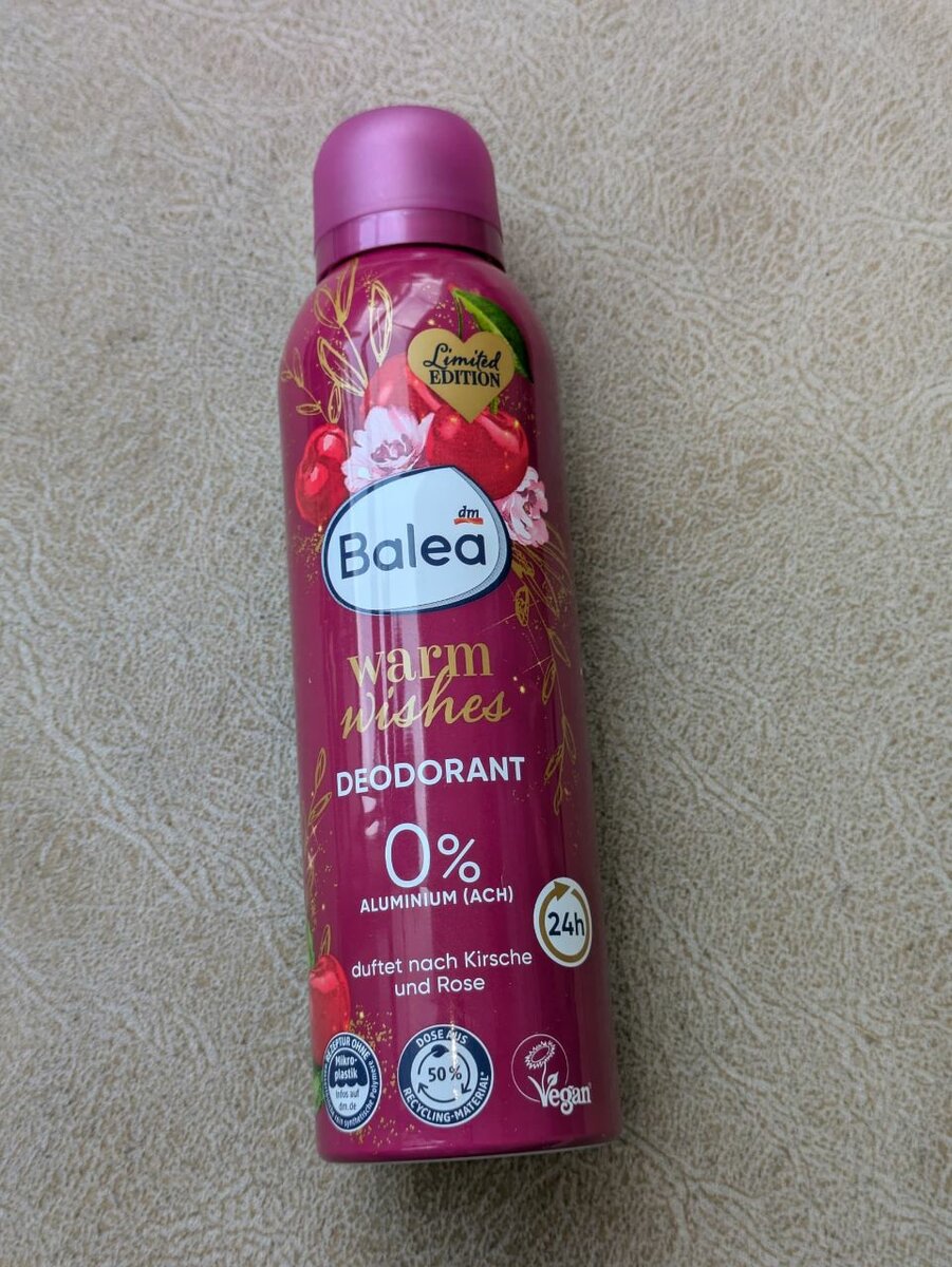 Profitez d'une fraîcheur durable avec le déodorant Balea Warm Wishes. Sans aluminium, ce produit vegan vous enveloppe de notes de cerise et de rose, parfait pour un usage quotidien. Édition limitée !