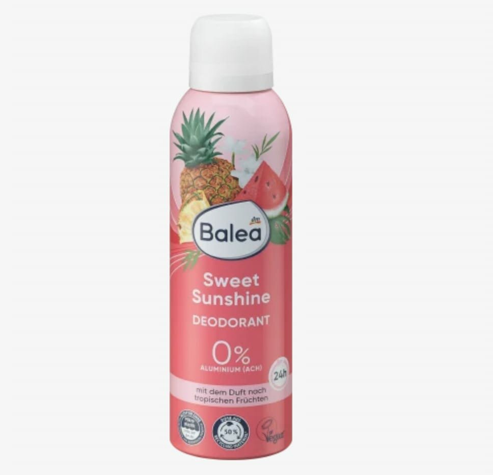 Déodorant Balea Sweet Sunshine sans aluminium, dure 24h. Parfum fruité tropical pour une fraîcheur exotique quotidienne. Parfait pour un mode de vie actif.