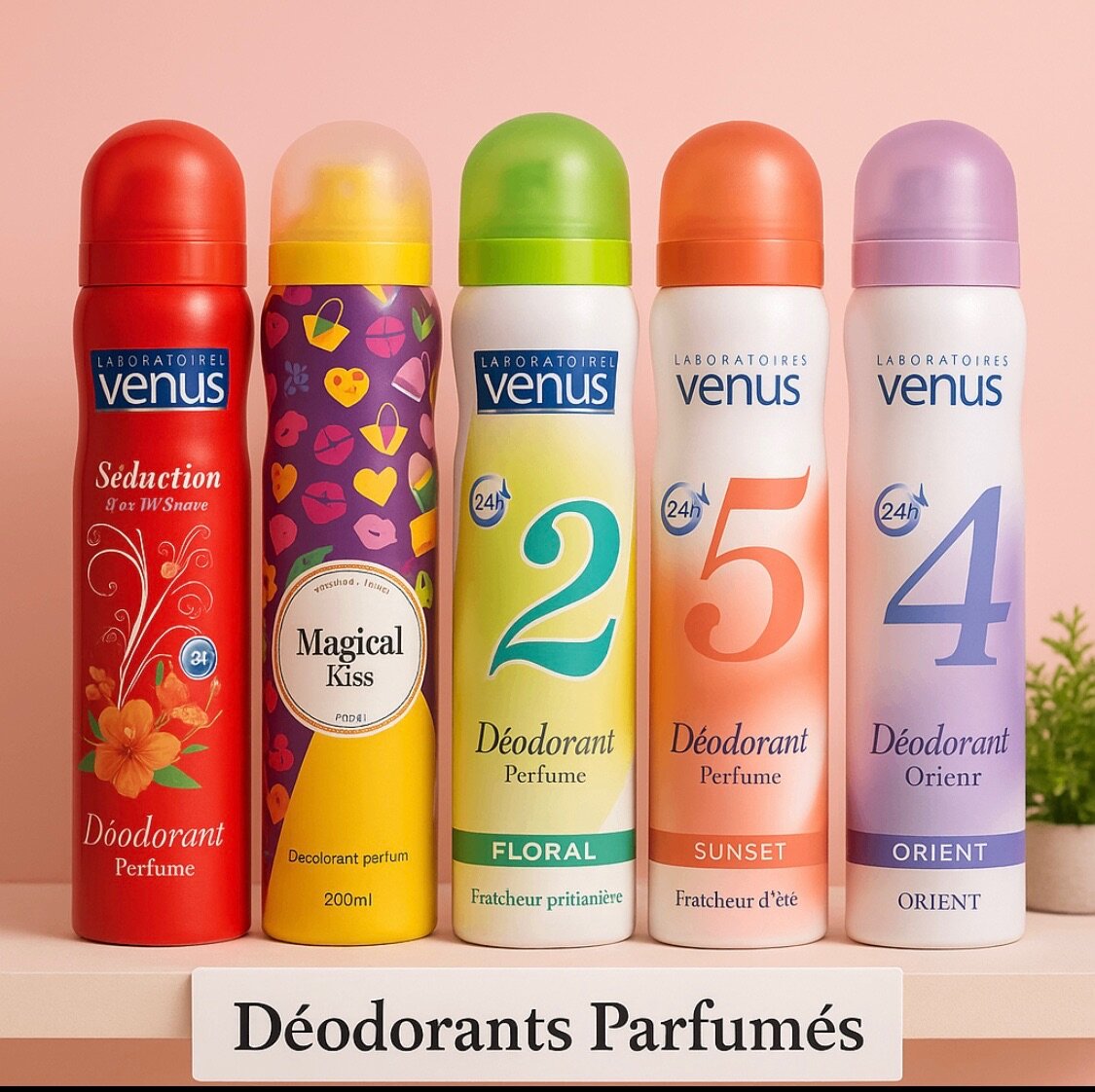 Découvrez la fraîcheur longue durée des Déodorants Parfumés de Venus. Offerts en cinq fragrances séduisantes, ils garantissent une protection 24h tout en ajoutant une touche de parfum à votre journée. Idéal pour chaque occasion!