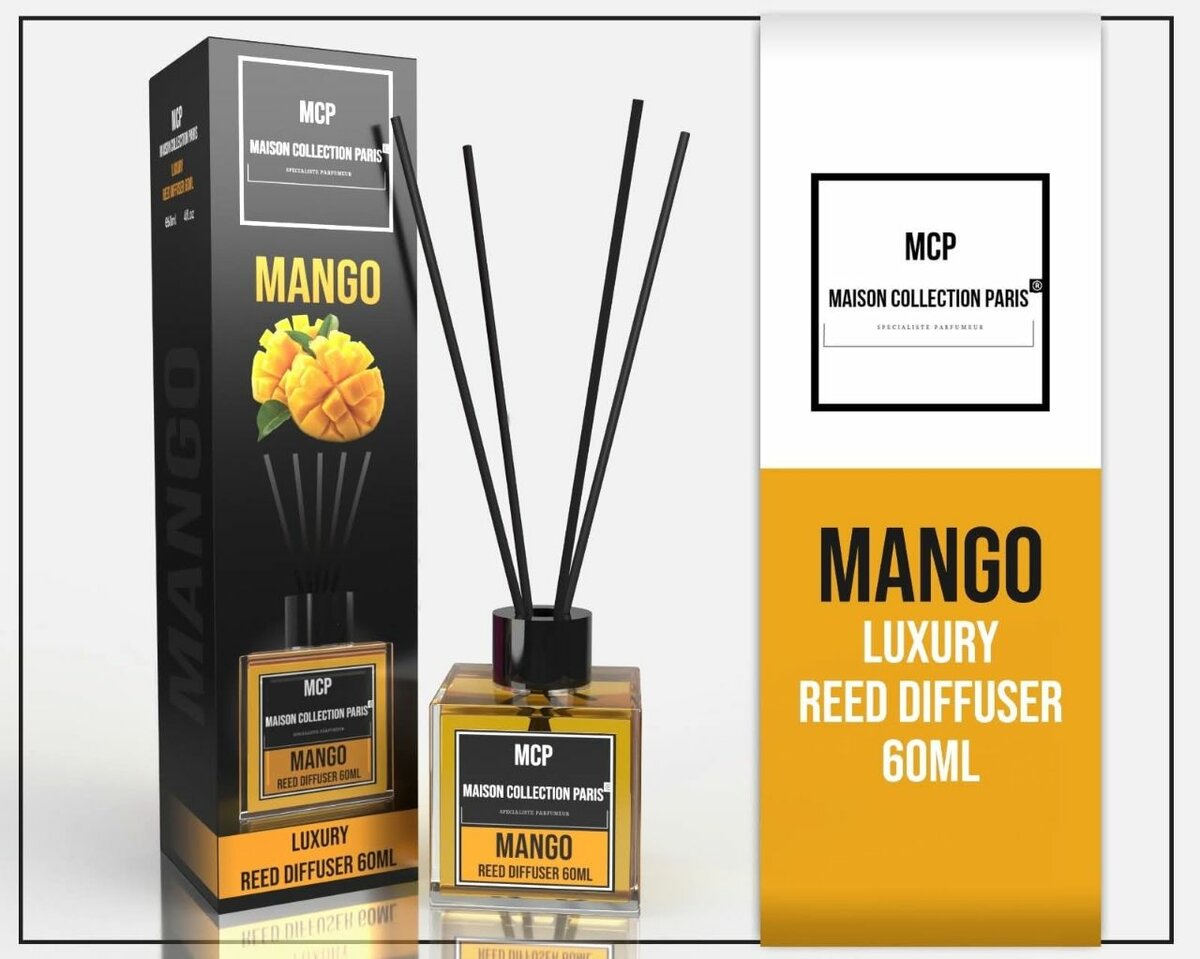 Diffuseur à bâtonnets de luxe 60ml au parfum exquis. Choix de mangue, rose vanille ou Côte d'Azur. Élégant pour la maison ou le bureau, offrant une ambiance apaisante et rafraîchissante.