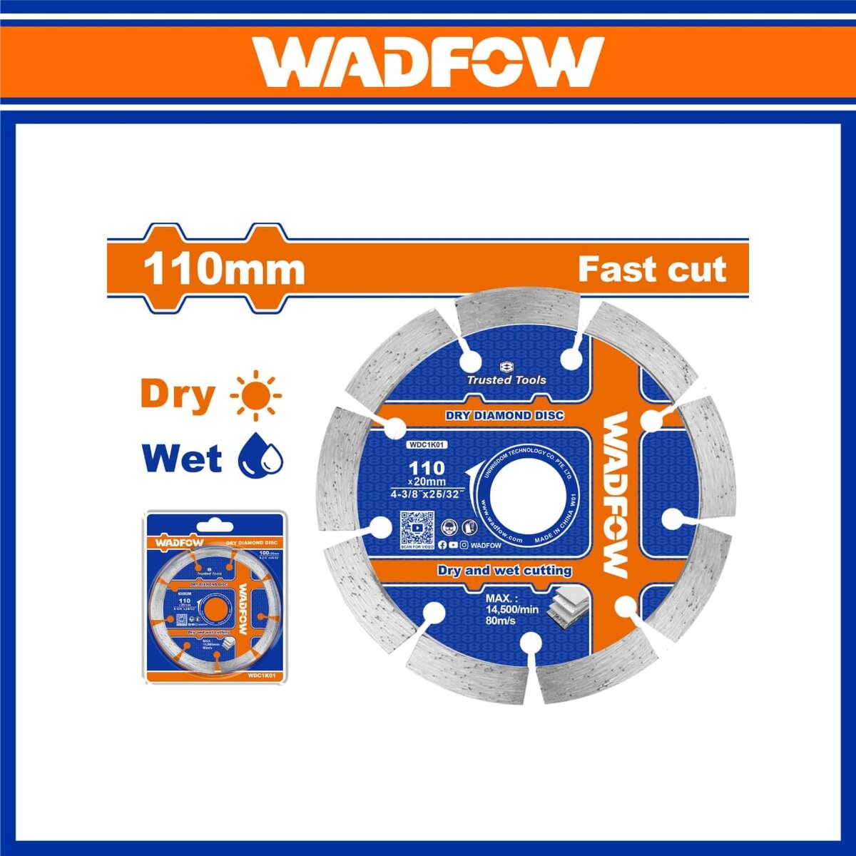 Disque diamant Wadfow 110mm pour coupe à sec et humide. Idéal pour bricolage et construction, offrant précision et efficacité. Compatible avec outils standards.