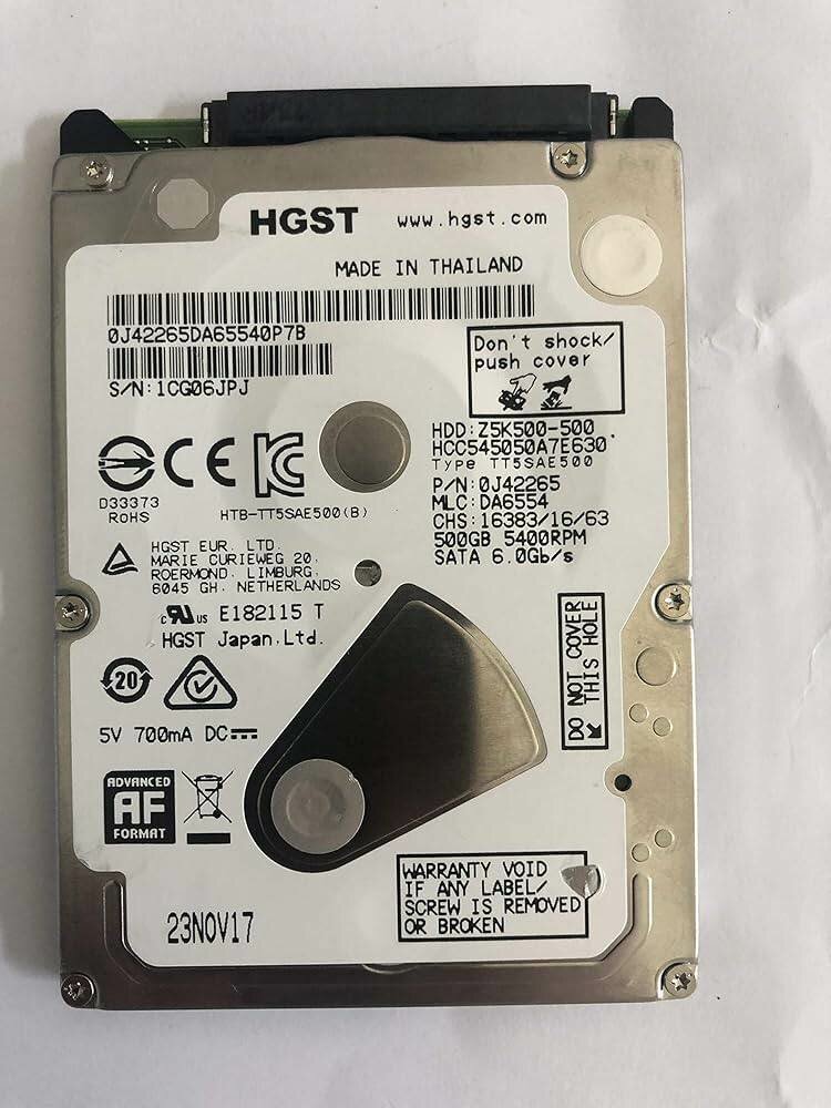 Le disque dur HGST visible sur l'image est un modèle de 2,5 pouces, probablement destiné aux ordinateurs portables, avec une interface SATA.