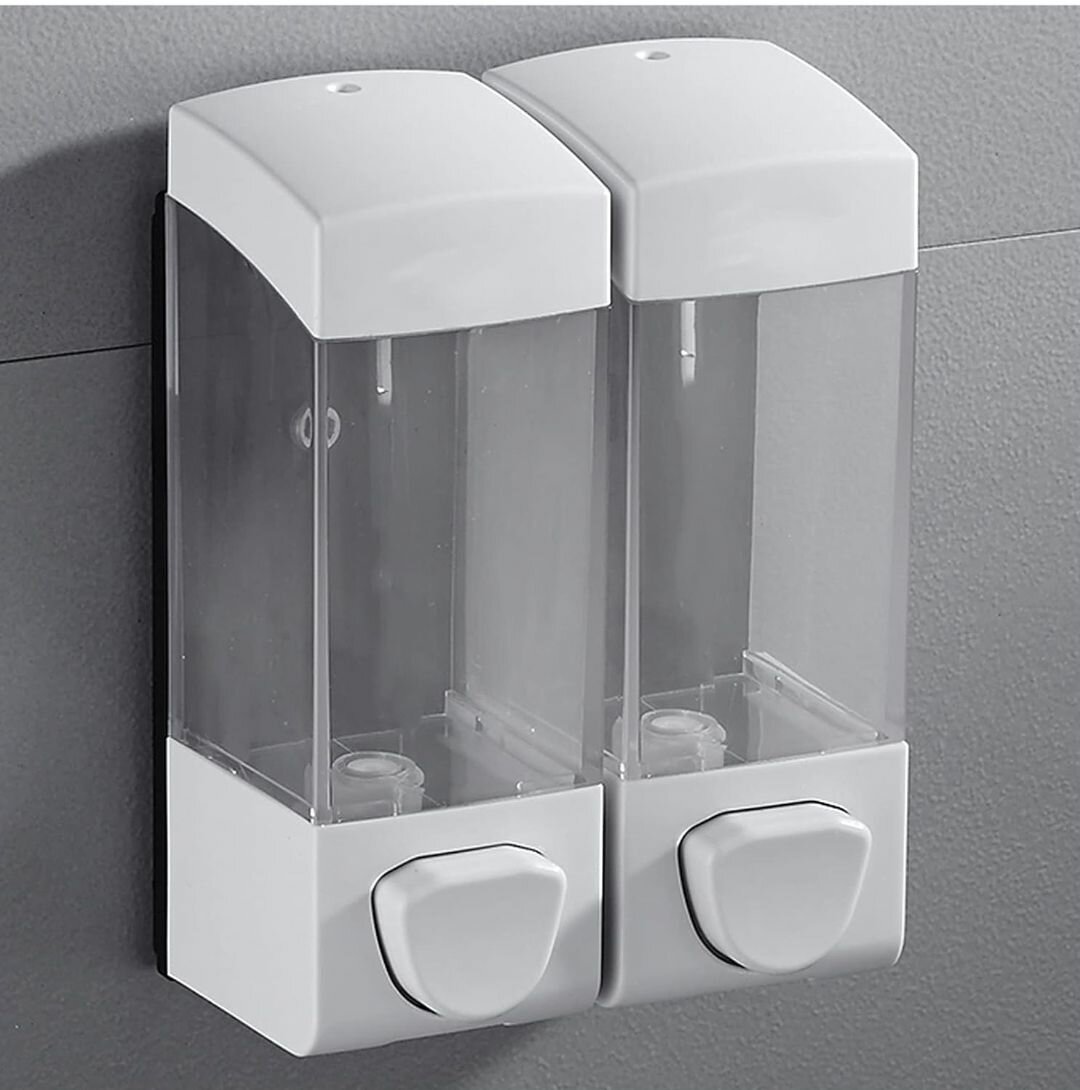 Distributeur de savon mural double pour salle de bain. Design élégant et facile à installer. Contenance visible et contrôle précis du dosage.