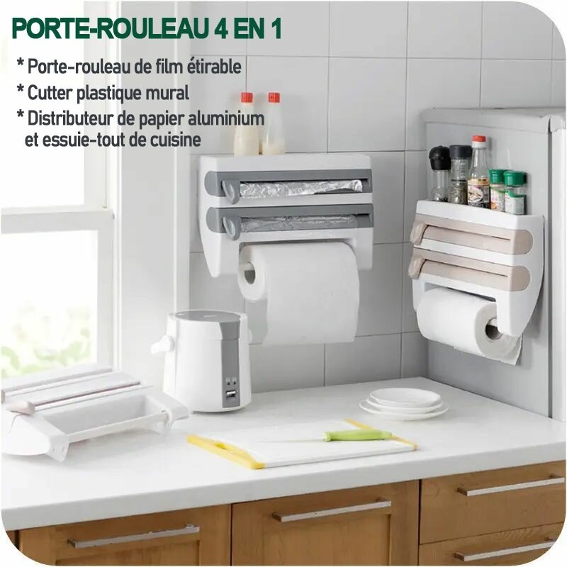 Optimisez votre cuisine avec ce distributeur mural 4 en 1. Idéal pour films étirables, papier alu et essuie-tout.