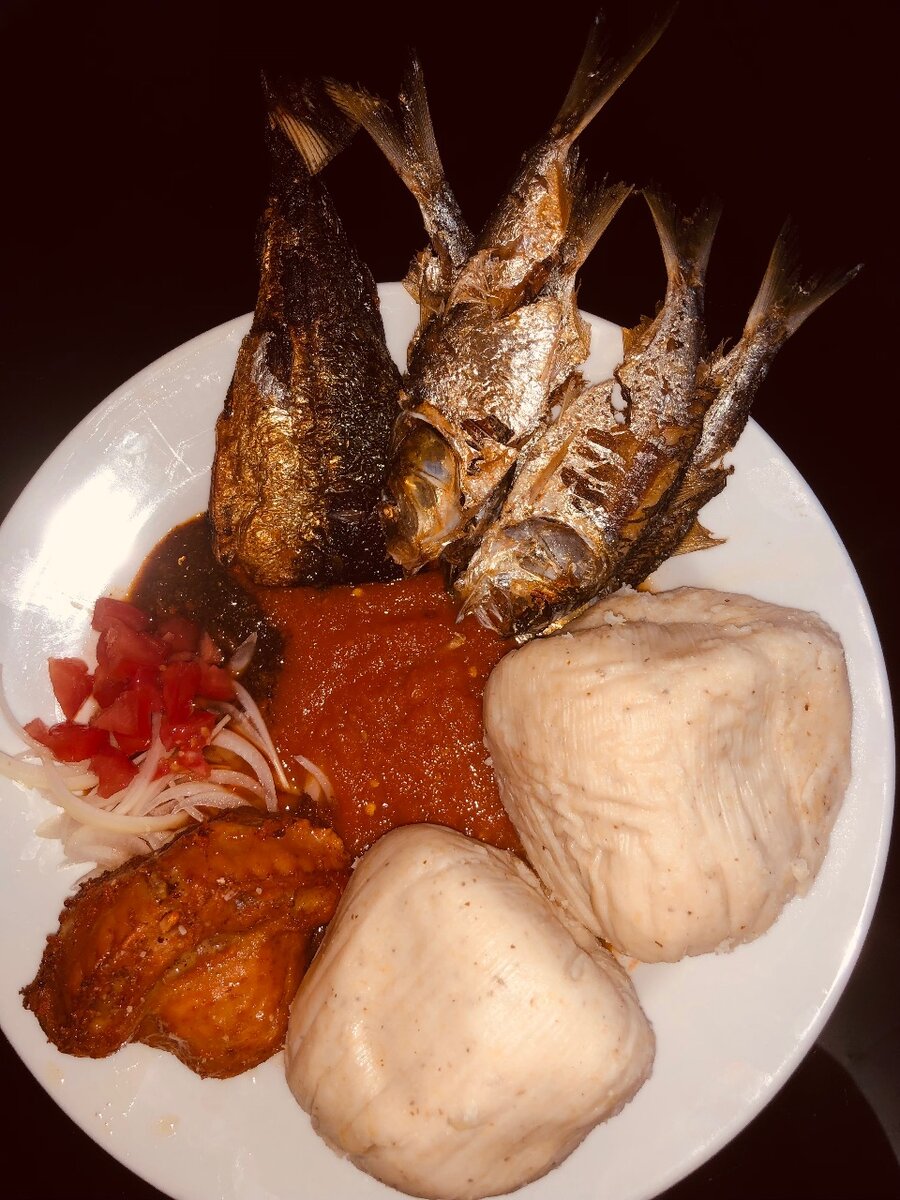 Dohkounou, sauce tomate, piment noir, poisson, croupion de dindon