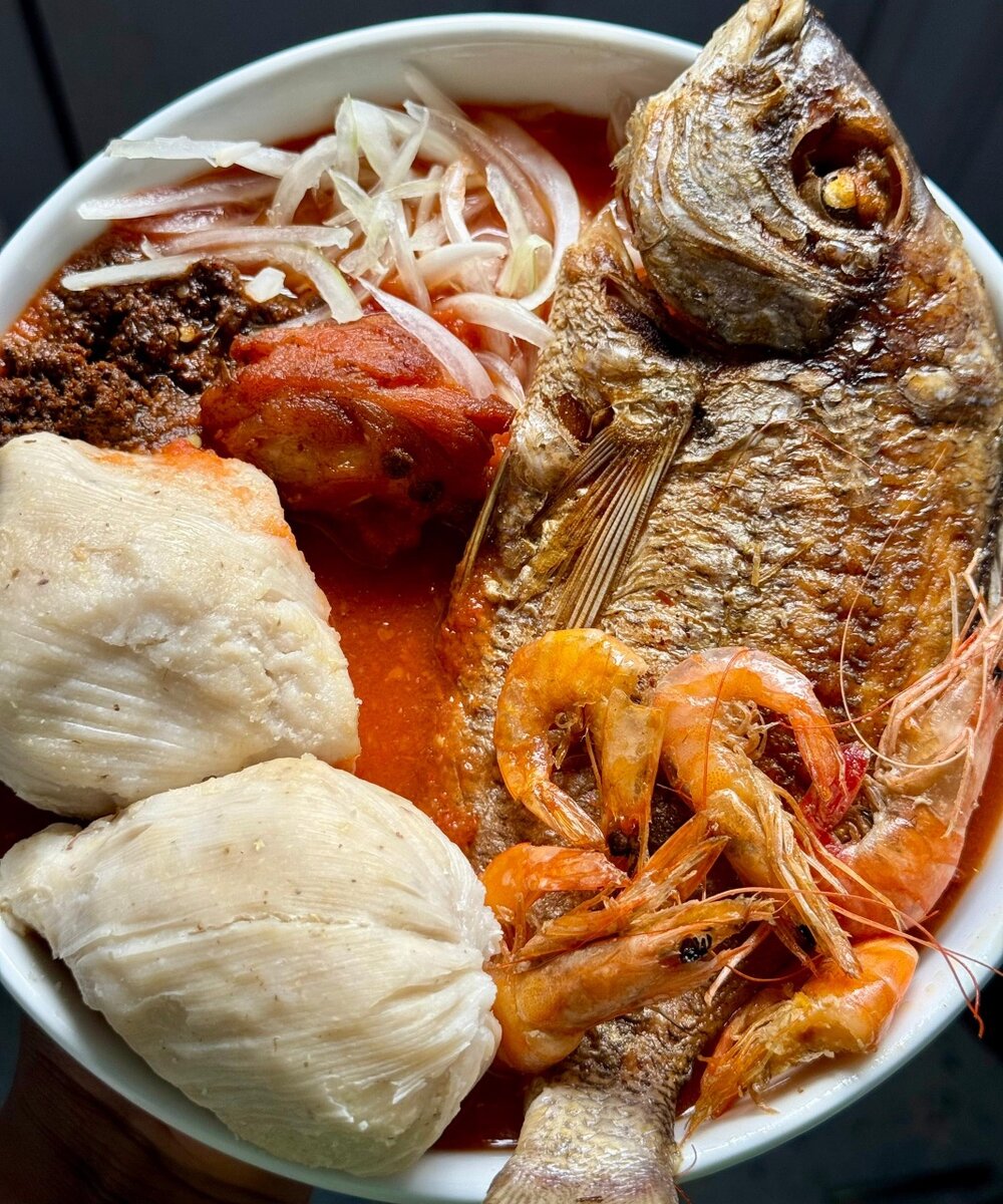 Savourez Notre DOKOUNOU( fait à base de maïs) avec Le PIMENT NOIR, une sauce tomate délicieuse, du Poisson frit, 4boule de Dokounou, des Crevettes OU Alevins, Dindon, et de loignon frais.