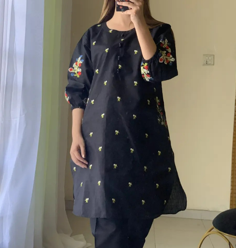 *Multi Colours Embroidery* ▶️ Fabric Doria Cotton ▶️ Size Medium & Large ▶️ M 21 Chest 38 Length ▶️ L 23 Chest 38 Length ▶️ Trouser Length 38 ▶️ Fine Quality Embroidery