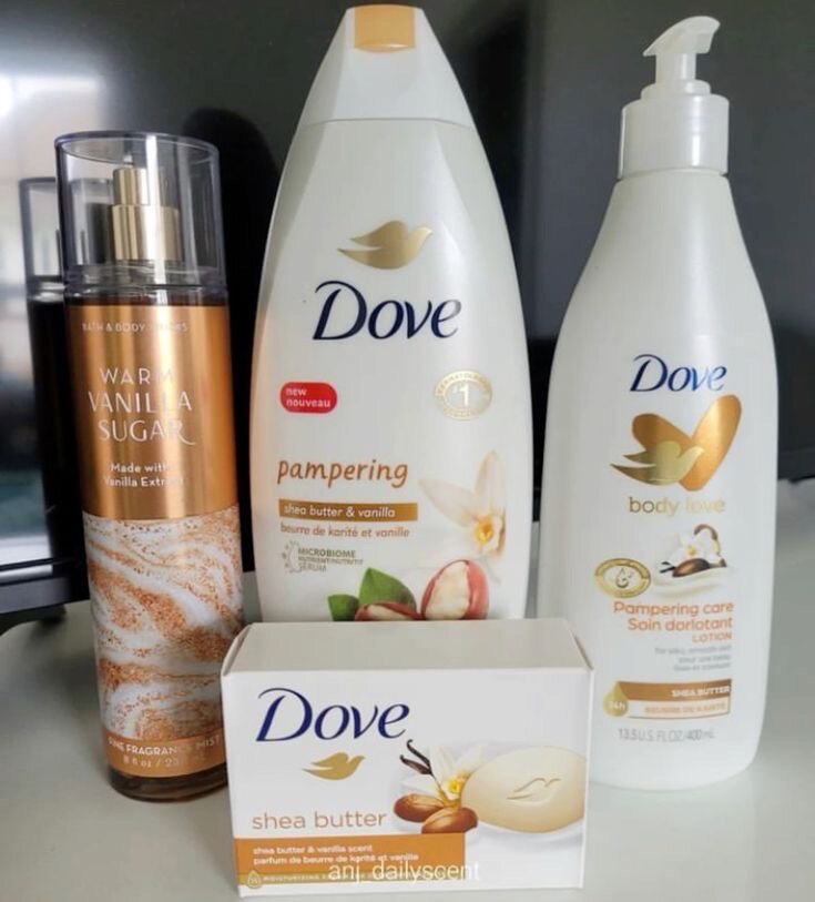 Dove shower gel,scrub,bar soap and Vaseline lotion