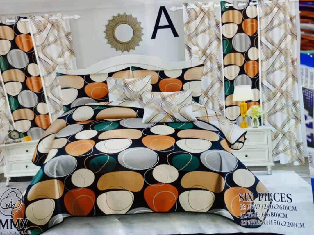 Ensemble draps, taies et rideaux 6 pièces 2 draps de 3 places 2 taies d'oreillers 2 rideaux