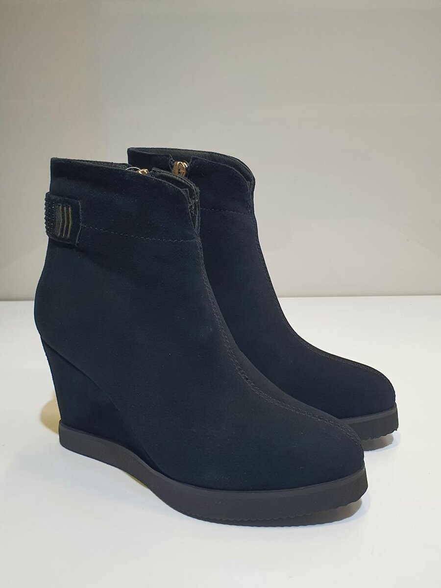 Материал: Натуральная замша Цвет: Черный Подошва: Резиновая, с рифлением Каблук: Скрытая платформа, высота около 5 см Застежка: Молния на боковой стороне Сезон: Зима Размер: 33 Арт: 5-4-20