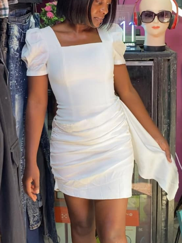 The dress is white, the sleeves and hem are multi-layered