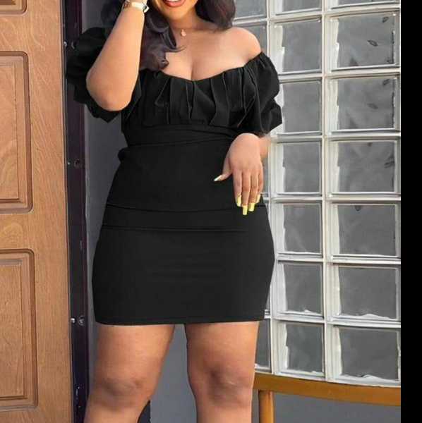 Black bodycon dress with a large rose on the shoulder