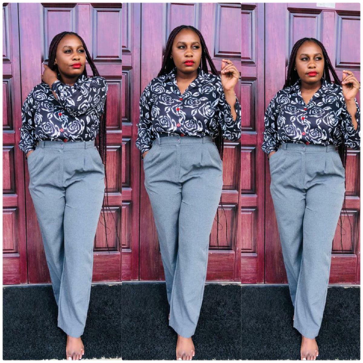 Set light pink blouse with print, size 12, dark gray trousers size 16