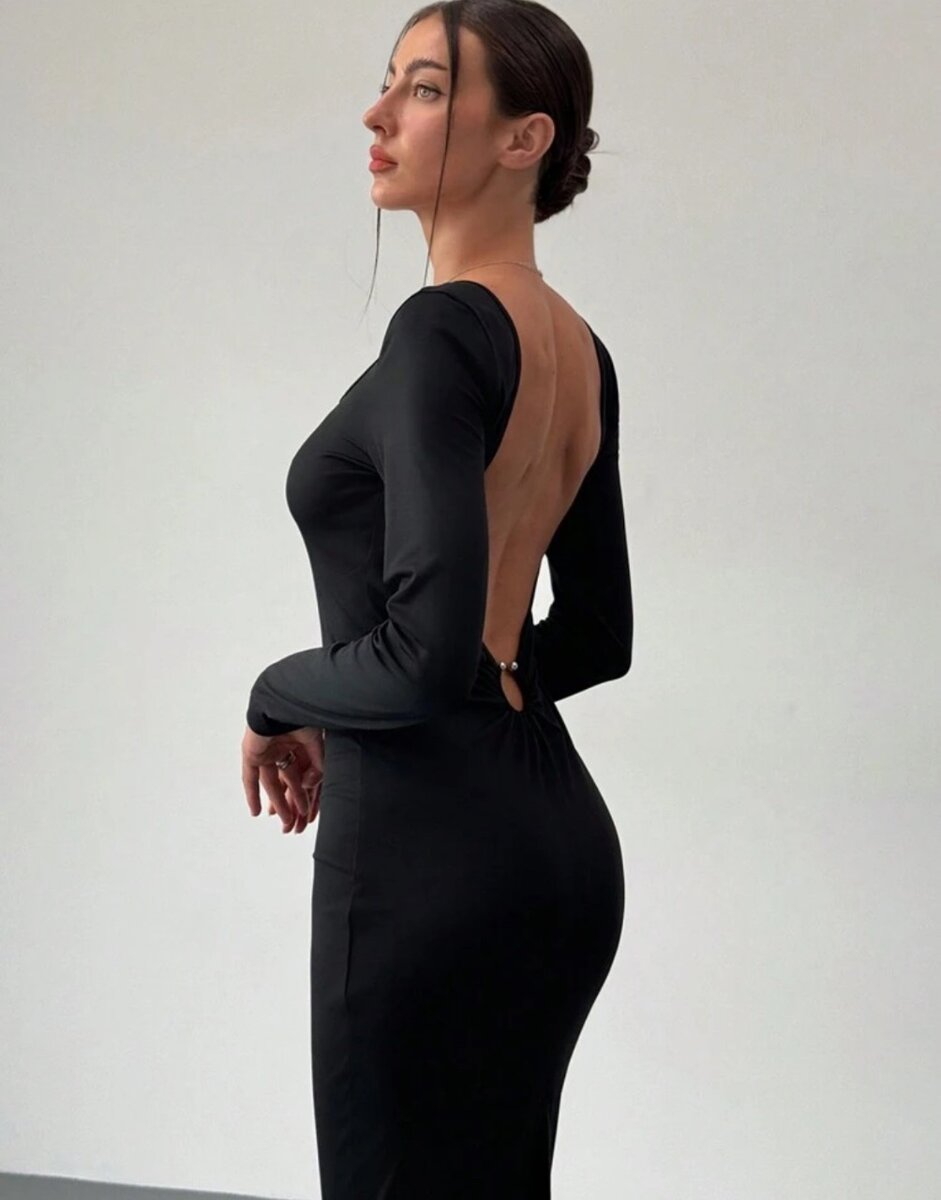 Элегантное чёрное платье-футляр с открытой спиной идеальный выбор для вечеринок, свиданий или мероприятий. Облегающий силуэт подчеркивает фигуру, длинные рукава добавляют элегантности, а открытая спина нотку сексуальности. Лаконичный дизайн и качественный материал сделают это платье вашим фаворитом