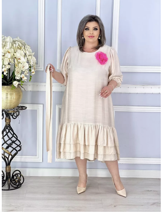 Платье выполнено из льняного материала в приятном бежевом цвете, что придает ему особый шарм. Его свободный крой и длина миди создают непринужденный и элегантный образ, подчеркивающий вашу женственность.