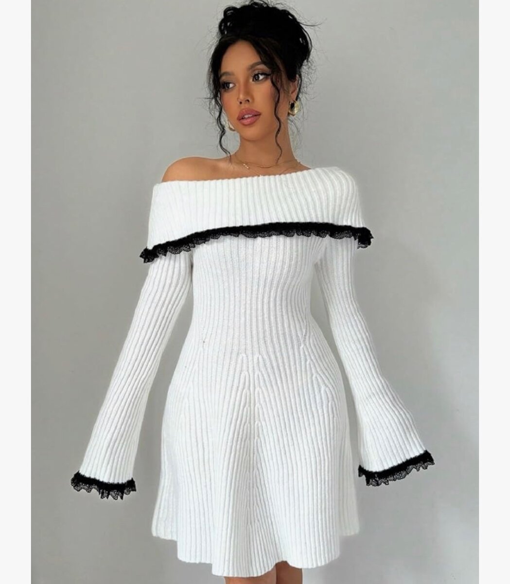 Трикотажное мини-платье с защипами и кружевной отделкой белого цвета идеально подойдет для весны и осени, на зиму