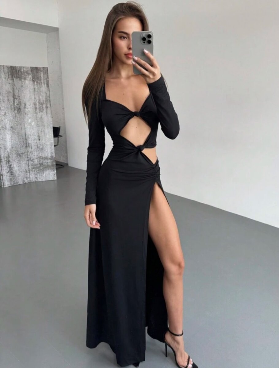 Элегантность + смелость в одном образе! Это платье создано для тех, кто не боится привлекать внимание. Облегающий крой подчёркивает фигуру, глубокие вырезы на талии и высокий разрез добавляют соблазнительности. Длинные рукава делают образ ещё более изысканным.