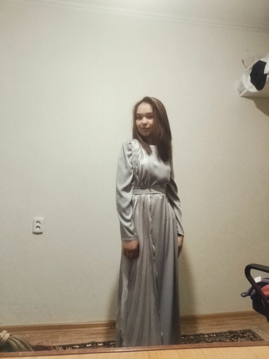 Платье выглядит элегантно и утончённо. Оно длинное, с легким переливающимся эффектом, что придаёт ему благородный вид. Дизайн с длинными рукавами и акцентом на плече добавляет интересные детали. Такое платье подойдет для торжественных мероприятий или вечернего выхода.