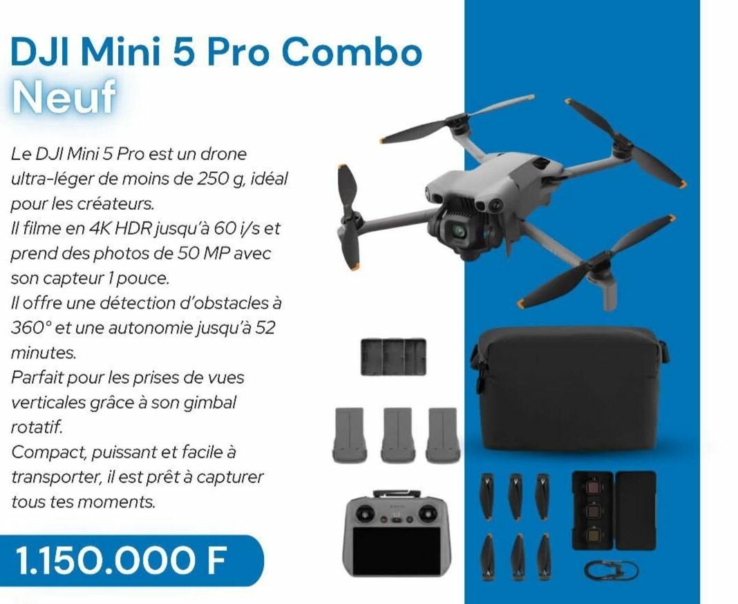 Découvrez le DJI Mini 5 Pro Combo, un drone ultra-léger de 250g, parfait pour les créateurs. Capturez en 4K HDR à 60 i/s et prenez des photos incroyables grâce à son capteur 50 MP. Idéal pour les prises de vue aériennes, facile à transporter et doté d'une autonomie de 52 minutes. Ne manquez pas une occasion de capturer vos meilleurs moments avec ce drone compact et performant.