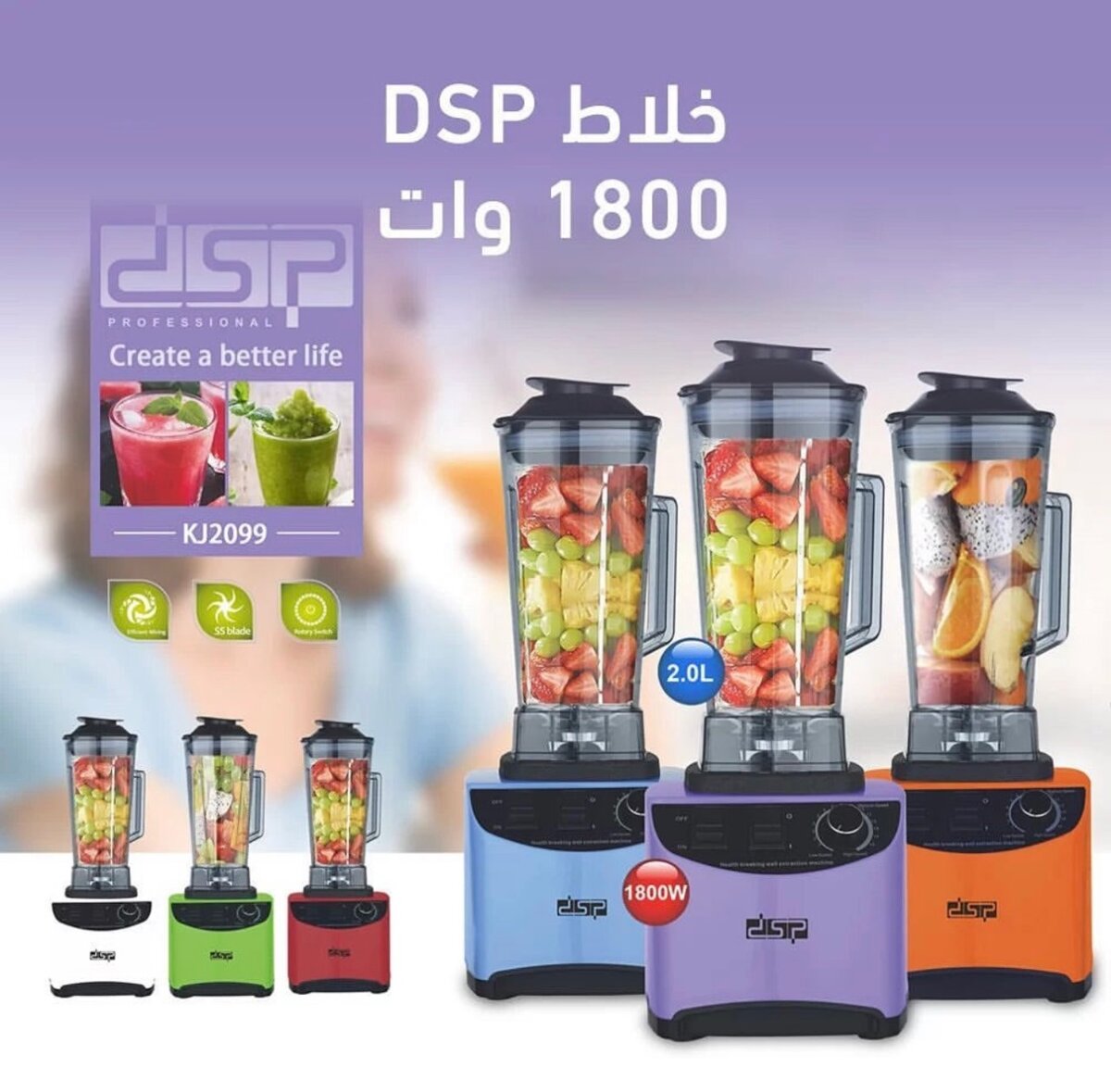 Блендер dsp KJ2099 имеет мощность в 1800 Вт, благодаря чему Вы можете подбирать режим измельчения для каждого продукта. Благодаря богатому функционалу dsp KJ2099 быстро измельчит фрукты для смузи, пюре.