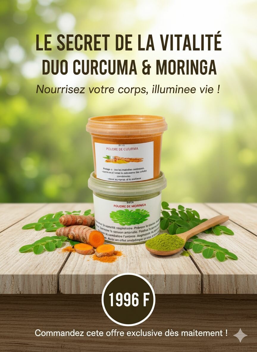Découvrez le secret de la vitalité avec notre duo Curcuma et Moringa. Nourrissez votre corps et éclaircissez votre vie avec ce mélange puissant et naturel. Parfait pour renforcer votre bien-être quotidien.