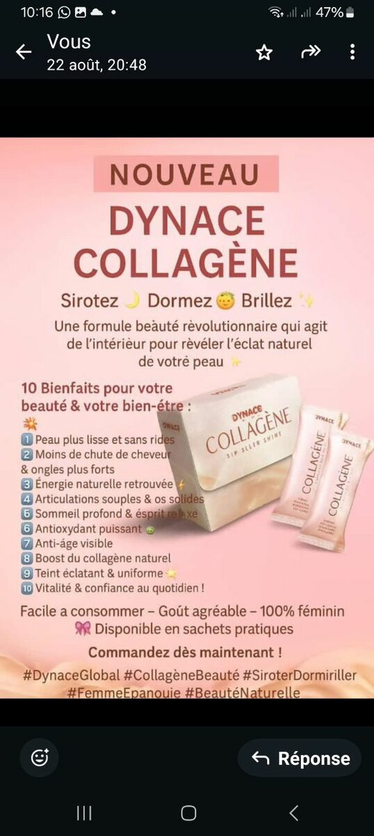 Rehaussez votre beauté naturelle avec Dynace Collagène. Formule innovante pour une peau éclatante et bien-être renforcé. Pratique et facile à consommer. Idéal pour une routine beauté quotidienne.