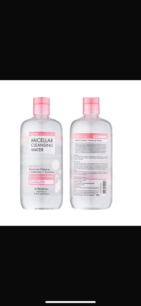 Découvrez notre eau micellaire nettoyante pour le visage, idéale pour tous les types de peau. Formulée pour éliminer les impuretés et le maquillage sans dessécher la peau.