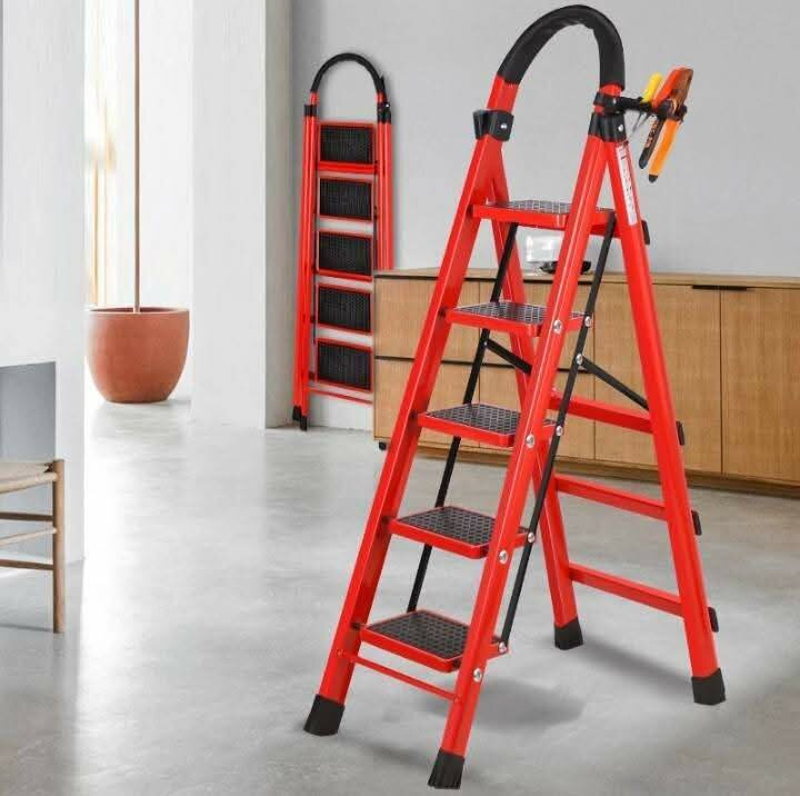 Échelle pliable robuste en aluminium rouge, idéale pour les travaux de bricolage à domicile. Conception sécurisée avec marches antidérapantes et poignée ergonomique. Facile à ranger.
