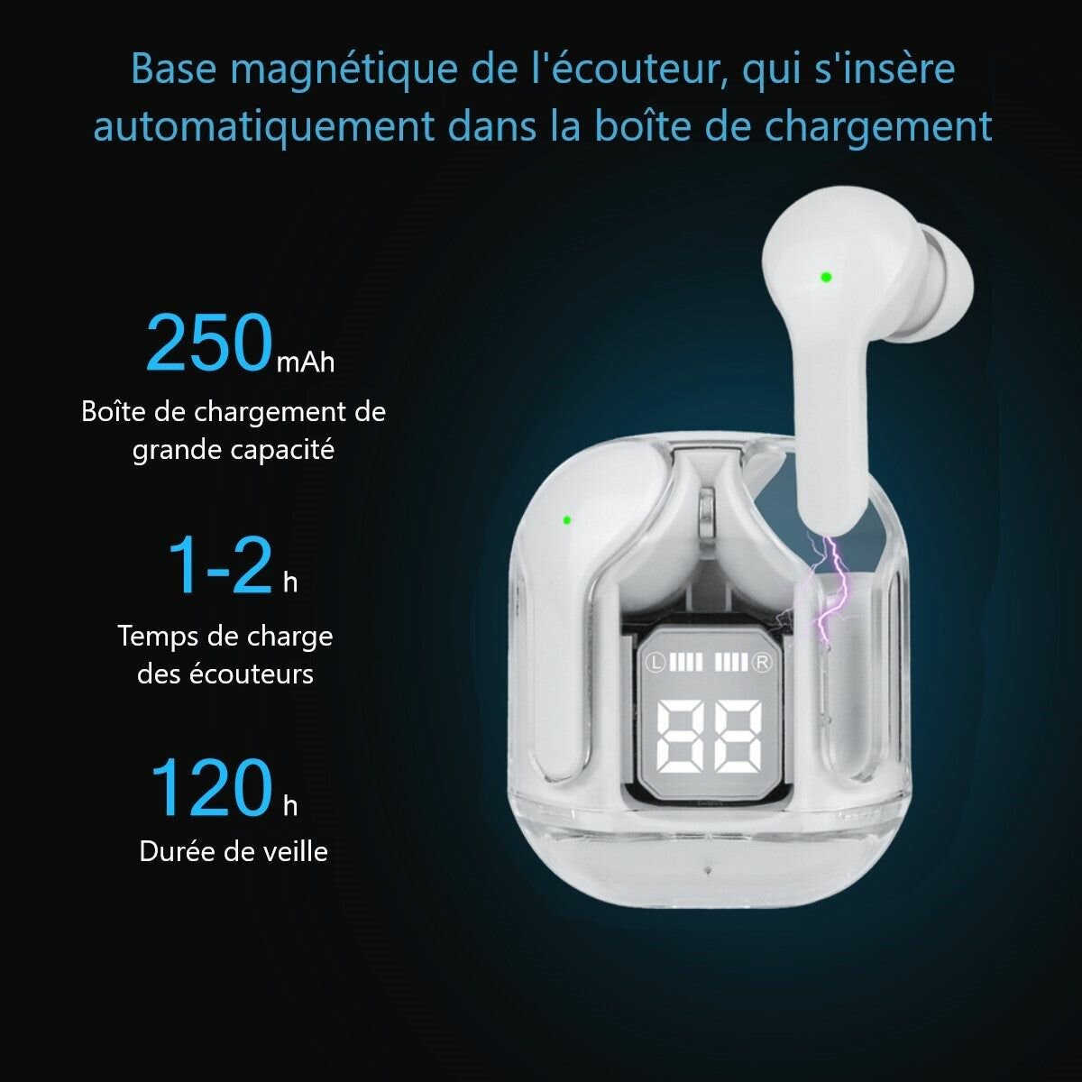 Profitez d'une expérience sonore exceptionnelle avec ces écouteurs Bluetooth sans fil. Conçus pour allier confort et technologie, ils offrent 120 heures de veille et se rechargent en seulement 1 à 2 heures. La boîte de charge magnétique de 250 mAh garantit une utilisation prolongée. Idéals pour le sport, le voyage ou le quotidien. Plongez dans un son de qualité supérieure dès maintenant !