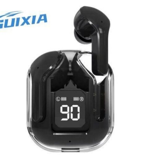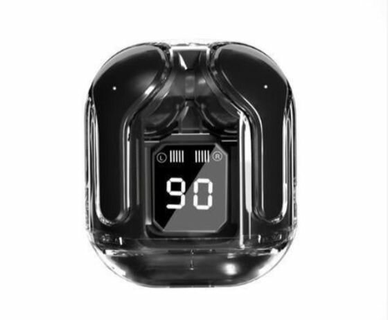 Chargeur sans fil transparent avec écran LCD affichant le niveau de batterie. Design moderne et innovant, idéal pour une utilisation domestique ou au bureau.